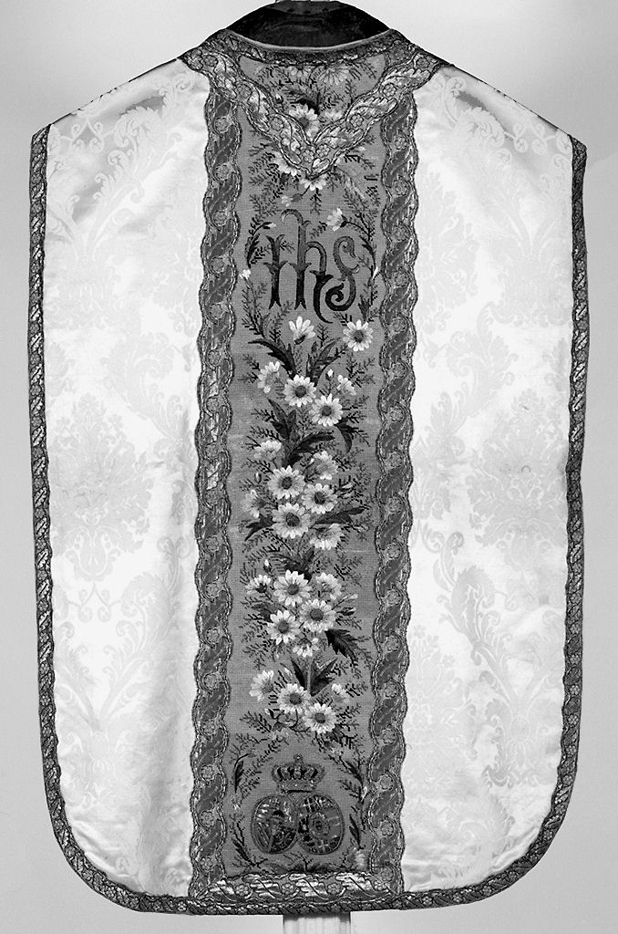Paramento liturgico composto da pianeta, velo da calice e stola. Fondo indamasco di seta bianca, croce e colonna in tela di cotone giallo oro ricamate in filo di cotone verde, bianco e marrone a mezzo punto con motivo a mazzi di margherite e rametti fogliacei: in alto monogramma cristologico ricamato, in basso stemma gentilizio ricamato in applicazione in gros de Tours di seta rossa e blu con motivi araldici ricamati in seta rossa, blu, nera e in argento e oro filati. Gli stemmi sono sormontati da una corona ricamata in applicazione di velluto di seta bordeaux ricamato in oro e argento filati, borchiette metalliche e paillettes d'oro. Galloni seguiti a telaio in seta gialla, oro filato e oro lamellare, fodera in taffetas di setagialla