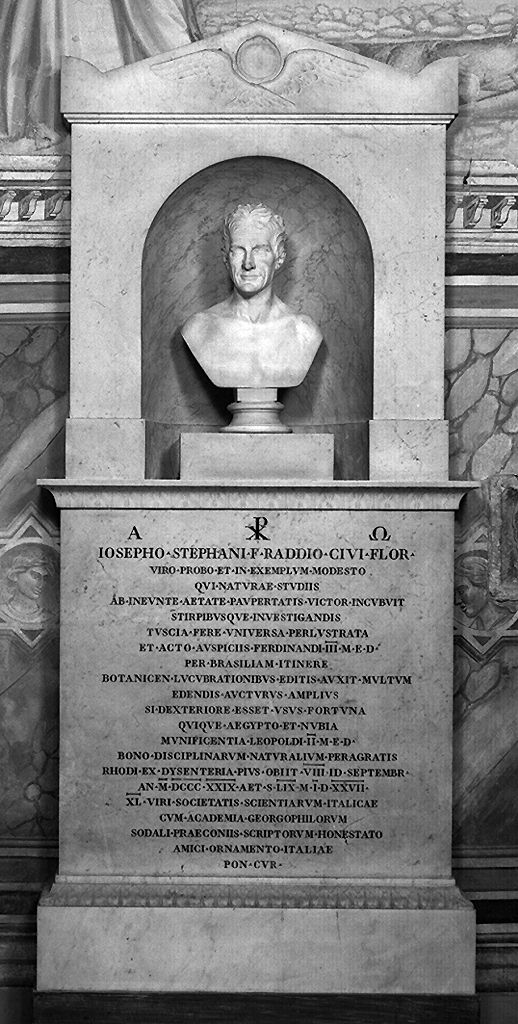 - ISCRIZIONI sulla stele - (alfa) Chr(istos) (omega)/ IOSEPHO STEPHANI F(---) RADDIO CIVI FLOR(ENTINO) / VIRO PROBO ET IN EXEMPLVM MODESTO / QUI NATVRAE STVDIIS / AB INEUNTE AETATE PAVPERTATIS VICTOR INCVBVIT / STIRPIBVSQVE INVESTIGANDIS / TVSCIA FERE VNIVERSA PERLVSTRATA / ET ACTO AVSPICIIS FERDINANDI III M(---) E(---) D(---) / PER BRASILIAM ITINERE / BOTANICEN(---) LVCVBRATIONIBVS EDITIS AVXIT MVLTVM / EDENDIS AVCTVRVS AMPLIVS / SI DEXTERIORE ESSET VSVS FORTVNA / QVIQVE AEGYPTO ET NVBIA / MVNIFICENTIA LEOPOLDI II M(---) E)---) D(---) / BONO DISCIPLINARVM NATVRALIVM PERAGRATIS / RHODI EX DYSENTERIA PIVS OBIIT VIII ID(IBVS) SEPTEMBR(IS) / AN(NO) M DCCC XXIX AET(ATIS) S(VAE) LIX M(ENSIVM) I D(IERVM) XXVII / XL VIRI SOCIETATIS SCIENTIARVM ITALICAE / CVM ACADEMIA GEORGOPHILORVM / SODALI PRAECONIIS SCRIPTORVM HONESTATO / AMICI ORNAMENTO ITALIAE / PON(ENDUM) CVR(AVERUNT) - lettere capitali/ lettere capitali -