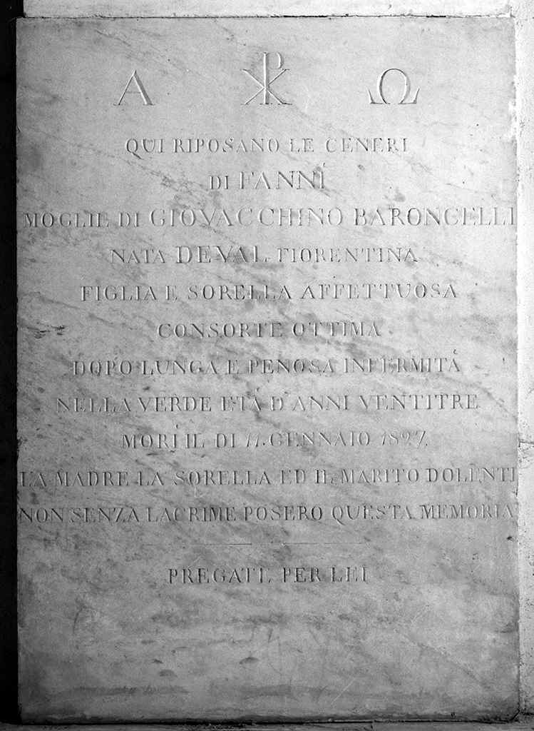 - ISCRIZIONI (alfa) CHR(ISTO) (omega) / QUI RIPOSANO LE CENERI / DI FANNI' / MOGLIE DIBIOVACCHINO BARONCELLI / NATA DEVAL FIORENTINA / FIGLIA E SORELLA AFFETTUOSA / CONSORTE OTTIMA / DOPO LUNGA E PENOSA INFERMITA' / NELLA VERDE ETA' D'ANNI VENTITRE' MORI' IL DI' 11 GENNAIO 1827 / LA MADRE LA SORELLA ED IL MARITO DOLENTI / NON SENZA LACRIME POSERO QUESTA MEMORIA / PREGATE PER LEI - lettere capitali/ numeri arabi -