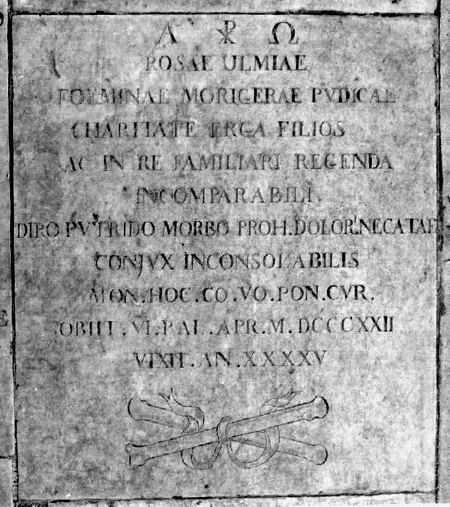 - ISCRIZIONI A(ALFA) P(AX) (OMEGA) / ROSAE ULMIAE / FOEMINAE MORIGERAE PUDICAE / CHARITATE ERGA FILIOS / AC IN RE FAMILIARI REGENDA / INCOMPARABILI / DIRO PUTRIDO MORBO PROH(...) DOLOR(...) NECATAE / CONIUX INCONSOLABILIS / MON(UMENTUM) HOC CO(...) VO(...) PON(ERE) CUR(AVIT) / OBIIT VI KAL(...) APR(...) MDCCCXXII / VIXIT AN(NOS) XXXXV - lettere capitali -