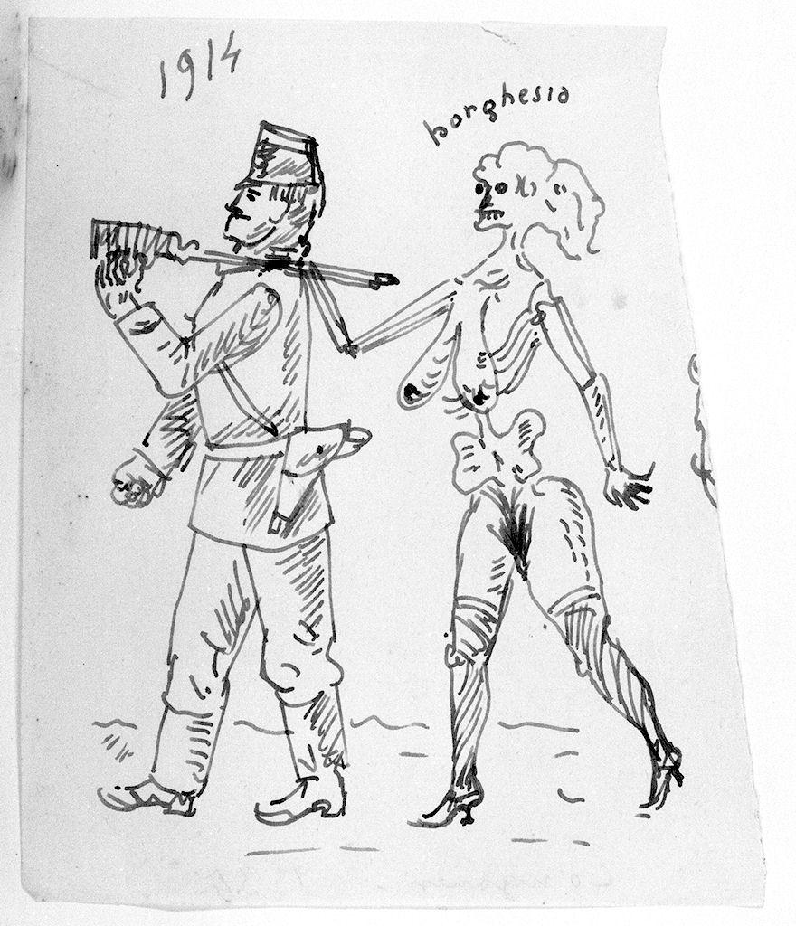 soldato che scorta figura caricaturale della borghesia