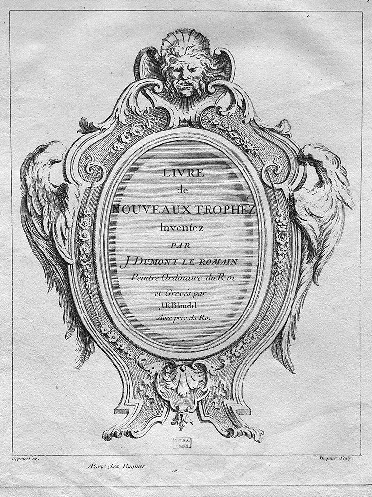 - ISCRIZIONI al centro del frontespizio - LIVRE / de / NOVEAUX TROPHEZ / INVENTEZ / PAR / J DUMONT LE ROMAIN / Peintre Ordinaire du Roi / et Gravès par / J.F.Blondel / Avec priv(ilege) du Roi - corsivo -