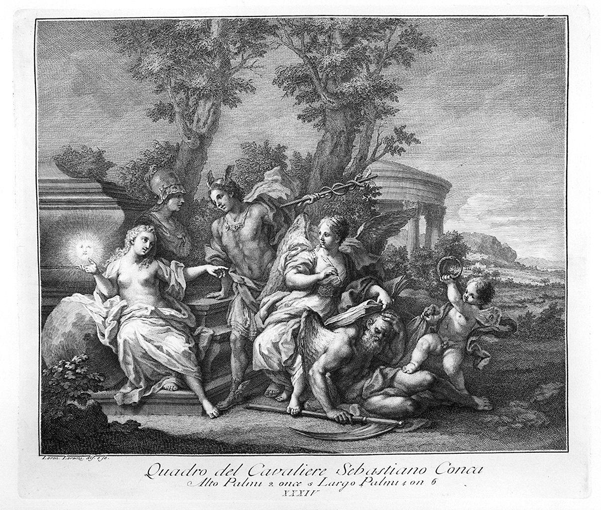 Divinità: Mercurio. Allegorie-simboli. Architetture: tempio. Sculture. Piante: alberi. Paesaggi