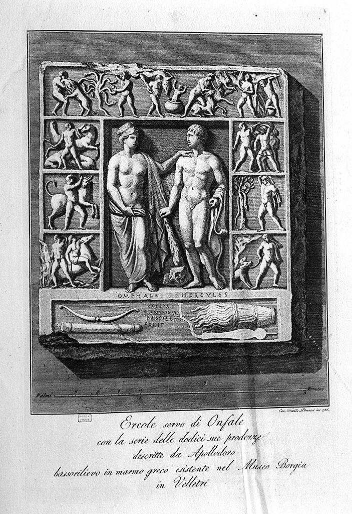 - ISCRIZIONI in basso al centro - Ercole servo di Onfale/ con la serie delle dodici sue prodezze/ descritte da Apollodoro/ bassorilievo in marmo greco esistente nel Museo Borgia/ in Velletri - altobasso -