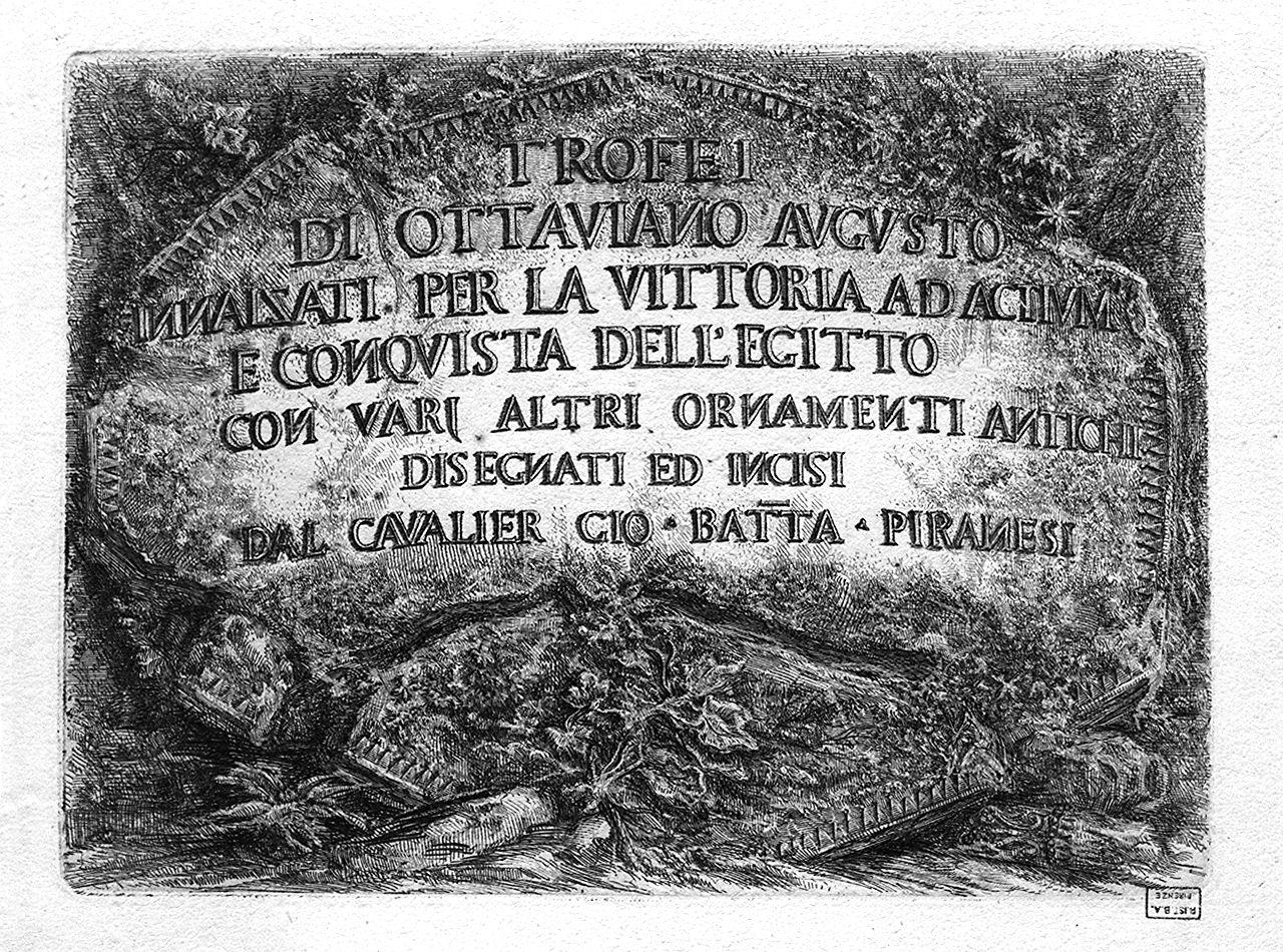 - ISCRIZIONI al centro - TROFEI / DI OTTAVIANO AUGUSTO / INNALZATI PER LA VITTORIA AD ACTIUM / E CONQUISTA DELL'EGITTO / CON VARI ALTRI ORNAMENTI ANTICHI / DISEGNATI ED INCISI / DAL CAVALIER GIO(VANNI) BATT(IST)A PIRANESI - lettere capitali -