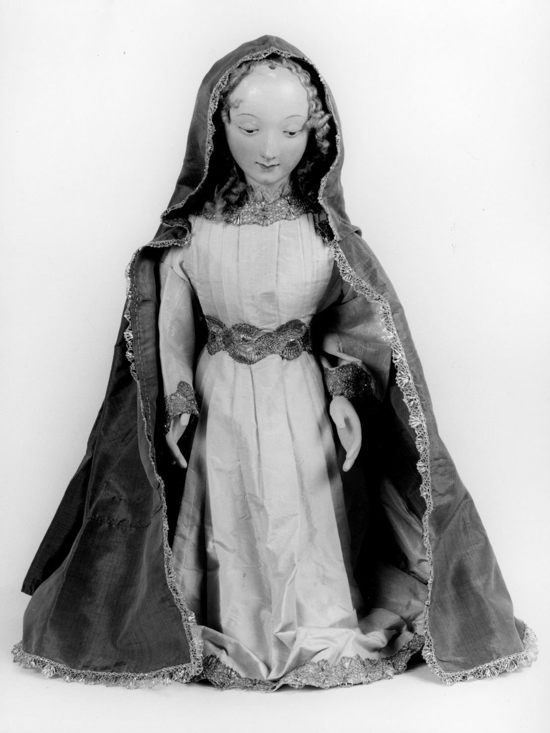 Maria è raffigurata in ginocchio, ha il capo chinato in avanti, i capellia boccoli ricadenti sulle spalle e le braccia lungo il corpo; indossa una veste a pieghe stretta in vita e bordata da galloni realizzati da un motivo a ventagli e un mantello lungo fino a terra ugualmente bordato da una trina a ventagli