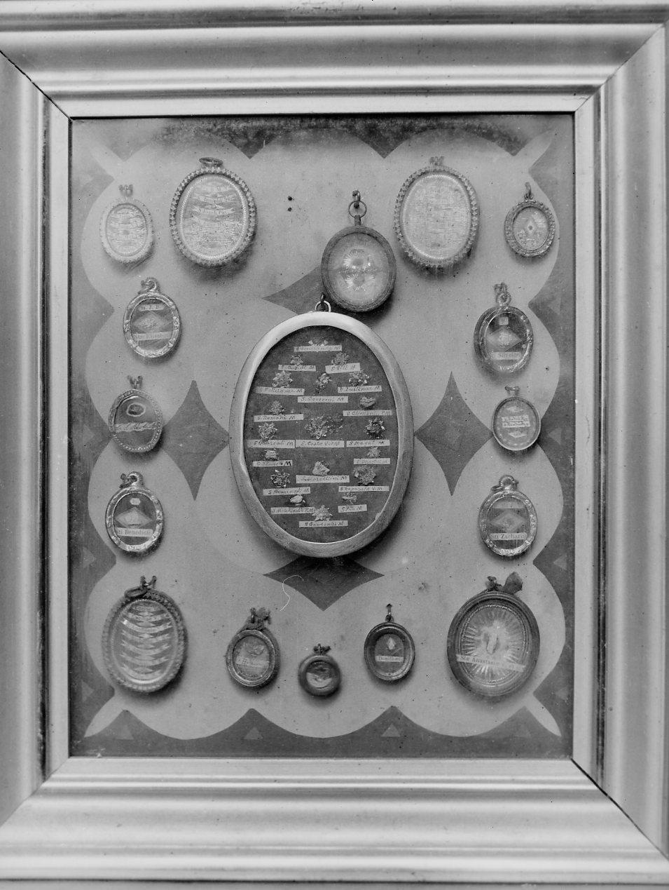 Cornice di legno dorato a listelli con gancio rotondo. Da vecchie fotografie si osserva come la cornice facesse parte di un quadretto che raccoglieva quattordici reliquie, smontato poi in un momento non precisabile