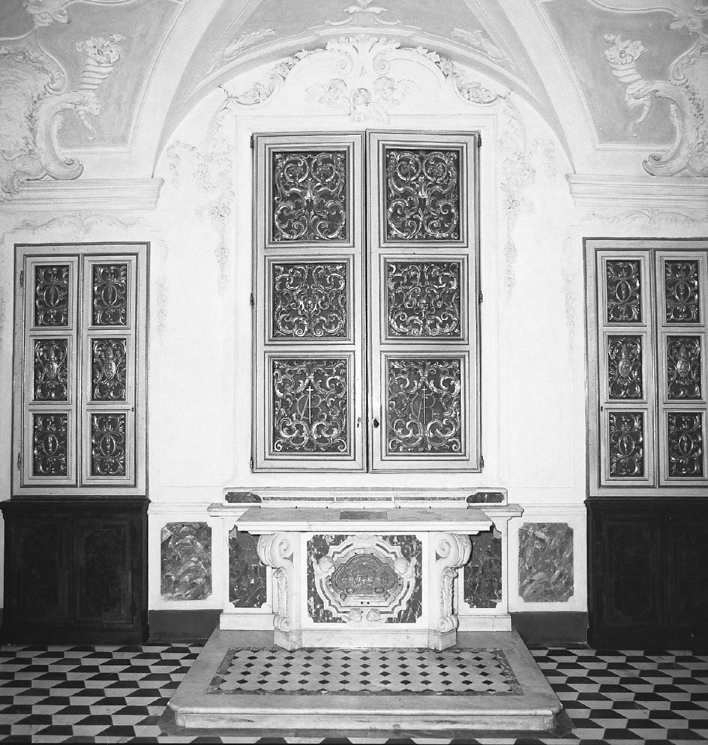 Armadio costruito sopra l'alatare. A due ante costituite, ciascuna, da tre specchiature con cornice a listello e complicati motivi decorativi a intaglio con elementi vegetali, il monogramma della certosa nelle due specchiature più basse, due testine in quelle mediane. All'interno vi sono tre mensole. Gli sportelli sono incernierati lla parete con tre cardini ciascuna