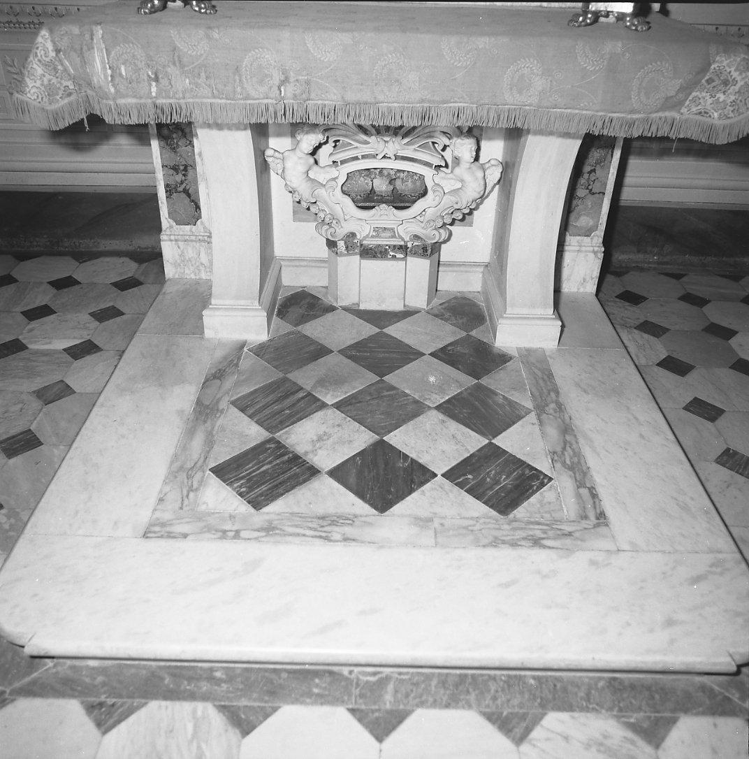 Pavimento costituito da un'alternanza di ottagoni di marmo bianco e rombi di marmo grigio con cornice di marmo grigio lungo le pareti. Lo scalino dell'alatre è costituito dall'alternanza di riquadri di marmo bianco e grigio