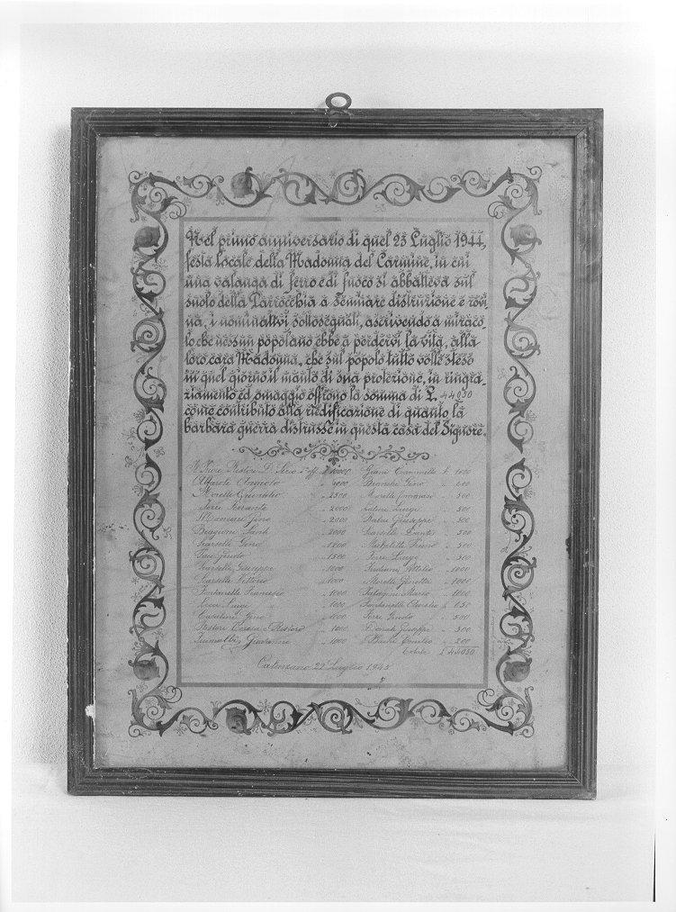 - ISCRIZIONI su tutta la pergamena - NEL PRIMO ANNIVERSARIO DI QUEL 23 LUGLIO 1944/ [...]/ CALENZANO 22 LUGLIO 1945// - corsivo -