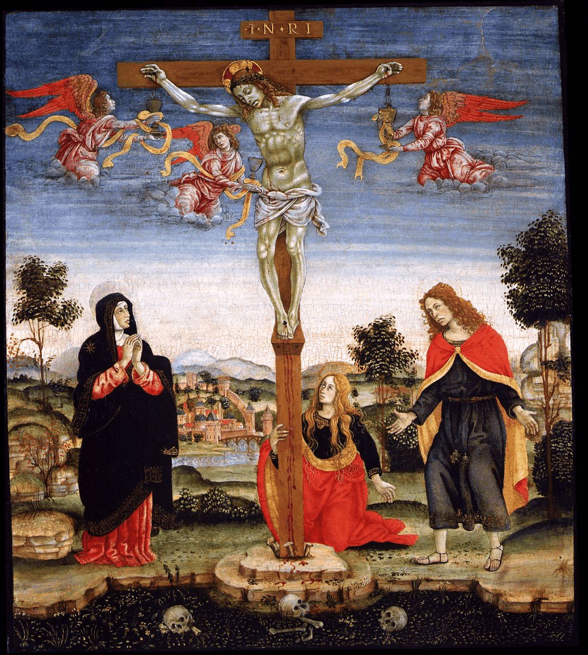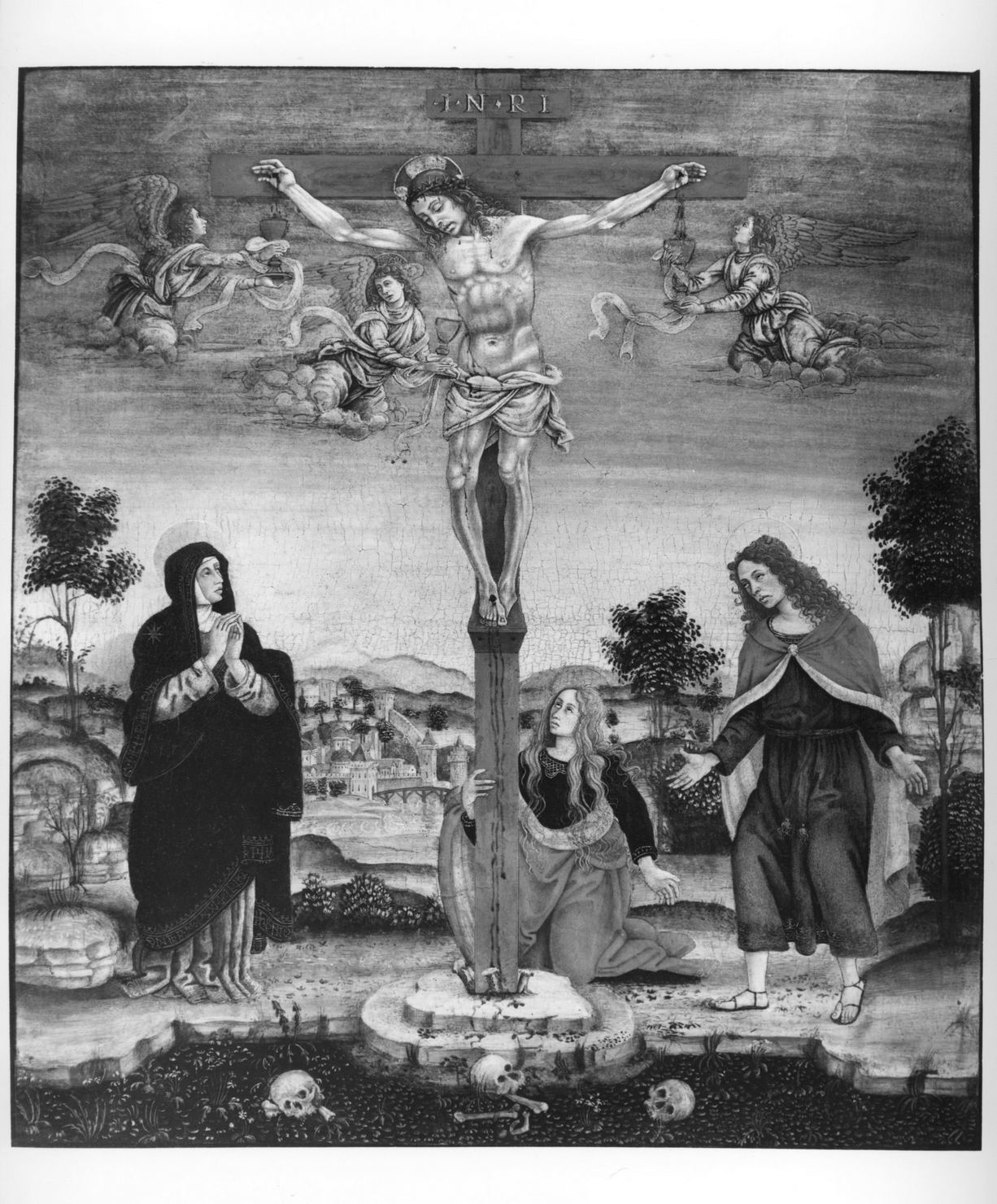 - NOTIZIE STORICO CRITICHE L'opera, proveniente dalla collezione privata del primicerio Francesco Crociani, ritenuta dal Berenson copia da Filippino Lippi, è stata successivamente considerata opera della sua bottega. La parte superiore della composizione, con la figura di Cristo sulla croce e gli angeli che raccolgono nel calice il sangue del Salvatore, è infatti una derivazione dalla pala con la "Crocifissione, la Vergine e San Francesco" realizzata dal Lippi nel 1496, su commissione del "piagnone" Francesco Valori, per la Cappella Valori nella Chiesa di S. Procolo a Firenze (già nel Kaiser Friedrich Museum di Berlino), andata distrutta nel 1945, mentre le figure della Madonna e di San Giovanni Evangelista sono riprese dallo stendardo di uguale soggetto, conservato nel Museo Horne di Firenze (Inv. 98), appartenente alla tarda attività del pittore. Più specificatamente la tavola è stata recentemente accostata (Martini L.) alla produzione tarda di un modesto allievo del Lippi, Francesco Botticini (1446-1498), per le analogie stilistiche riscontrate con opere a lui riferite, quali gli "Angeli musicanti" del Museo della Collegiata di Empoli e l'"Adorazione del Bambino con angelo" del Museo del Petit Palais di Avignone