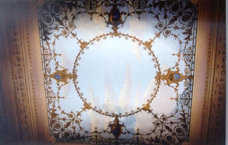 - NOTIZIE STORICO CRITICHE Il soffitto completa la decorazione dell 'aula dello scalone ed è ascrivibile allo stesso Pietro della Valle, responsabile della decorazione delle pareti (si veda la scheda precedente), o al fratello Giuseppe, specializzato all'interno della bottega Della Valle proprio nella esecuzione degli ornati geometrici. Il tipo di decorazione a girali e racemi floreali, qui caratterizzato dallo schema compositivo neoclassico, fu uno degli elementi ricorrenti anche delle loro note scagliole, che presentavano un quadro policromo centrale circondato da un fregio ininterrotto di tali motivi. La novità e la perizia dell'esecutore andrà individuata inoltre nella volontà di simulare un pergolato non composto da vegetali, bensì ma una grata metallica, secondo un gusto per la decorazione accademica unita all'innovazione tecnologica che fu tipico dell'eclettismo e della borghesia commerciale livornese, di cui Francesco Mimbelli fu esponente