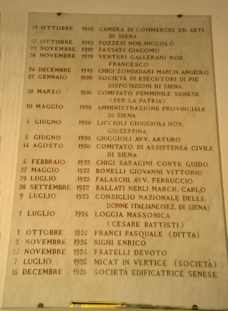 - ISCRIZIONI a tutto campo - PARTINI SARROCCHI ADELE / MONTE DEI PASCHI DI SIENA / MUNICIPIO DI SIENA / 9 MAGGIO 1919 SCLAVO PROF(ESSORE) ACHILLE / 24 GIUGNO 1919 PARTINI ING(EGNERE) LUIGI / 3 LUGLIO 1919 N(...) N(...) / 12 LUGLIO 1919 BANDINI AVV(OCATO) UMBERTO / 13 LUGLIO 1919 PICCOLOMINI DELLA TRIANA / CONTE NICCOLO' / (...) - lettere capitali -
