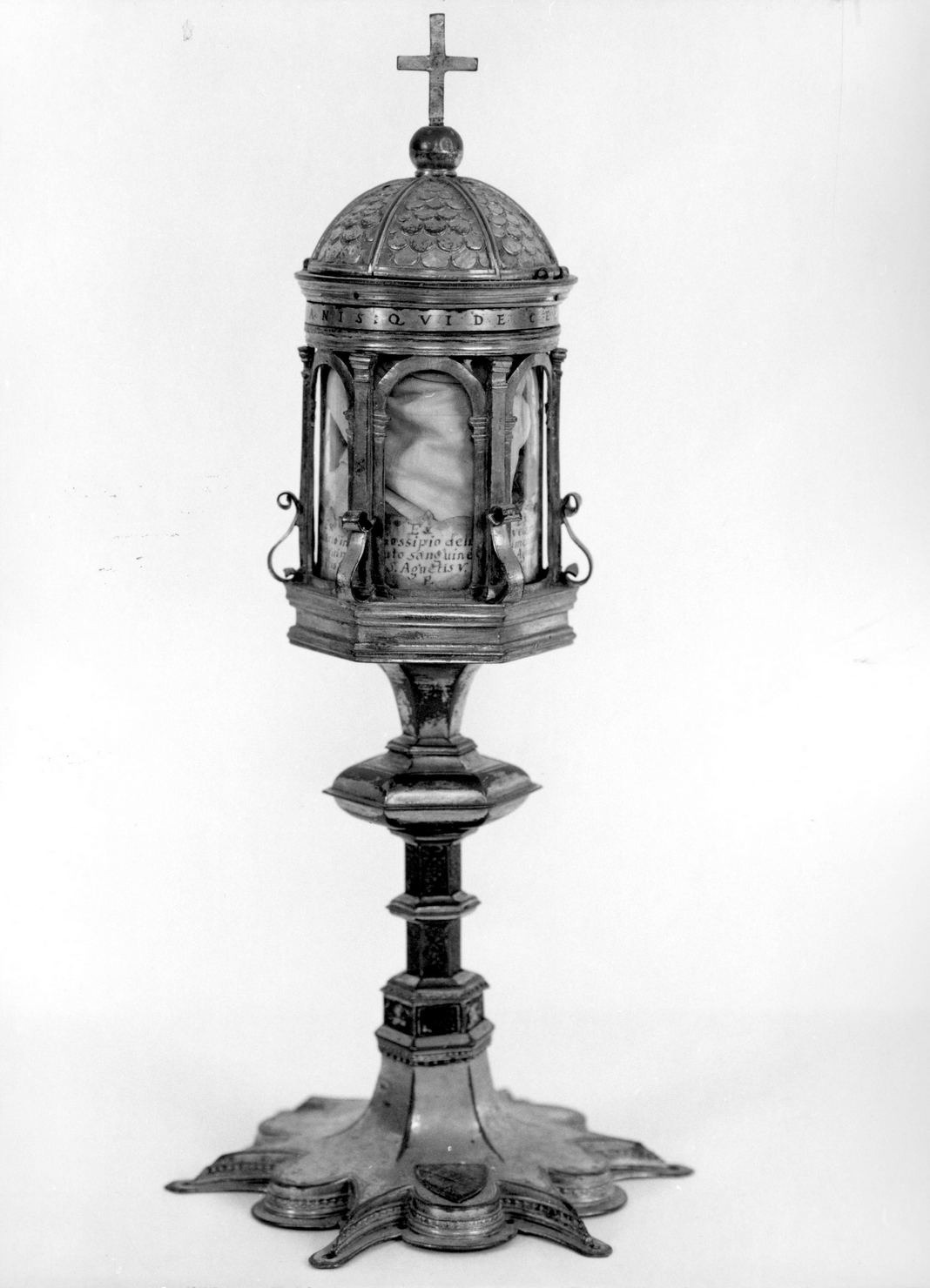 - NOTIZIE STORICO CRITICHE L'iscrizione presente sulla cornice superiore della teca fa pensare che il manufatto in origine fosse destinato alla custodia delle particole consacrate. E' probabile, quindi, che ci troviamo di fronte ad una pisside, che col tempo ha cambiato la propria destinazione d'uso, forse in conseguenza delle nuove disposizioni liturgiche dettate dalla controriforma.Lo stemma presente sul piede del reliquiario appartiene alla famiglia Pucci e forse, in particolare, a Giovanni Maria Pucci, il quale discese, da parte del padre, dai Pucci, per ava paterna, dai Tarugi, per ava materna, dagli Spinucci, tutte casate di Montepulciano e, per madre dai Saracini di Siena