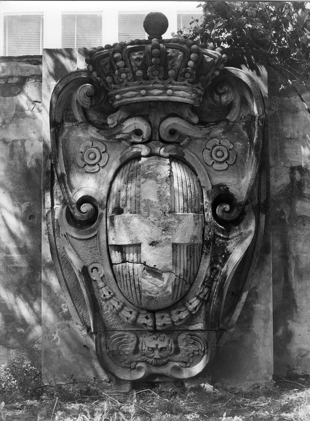 Stemma ovale con croce al centro, circondato da cornice a volute e decorate con due roselline, un festone e una testa alata di leone. Lo stemma è sormontato da una corona palatina