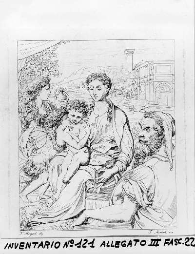 Soggetti sacri: Sacra famiglia con san Giovanni Battista bambino. Architetture: edifici classici