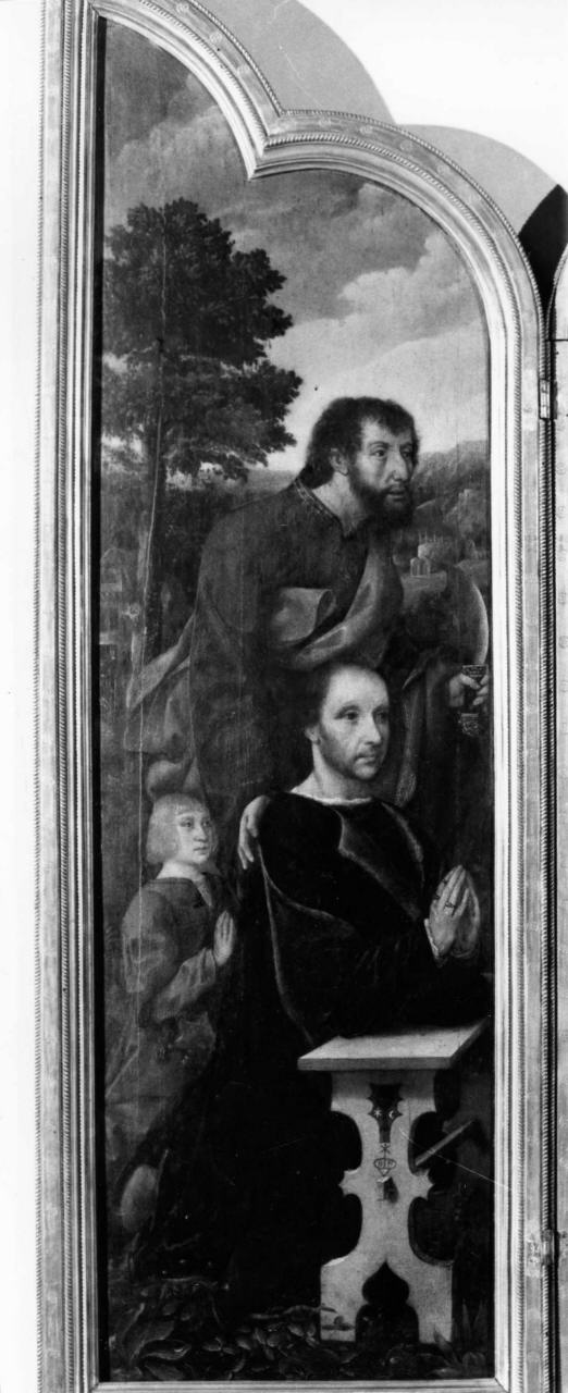 figura maschile inginocchiata con bambino e San Bartolomeo
