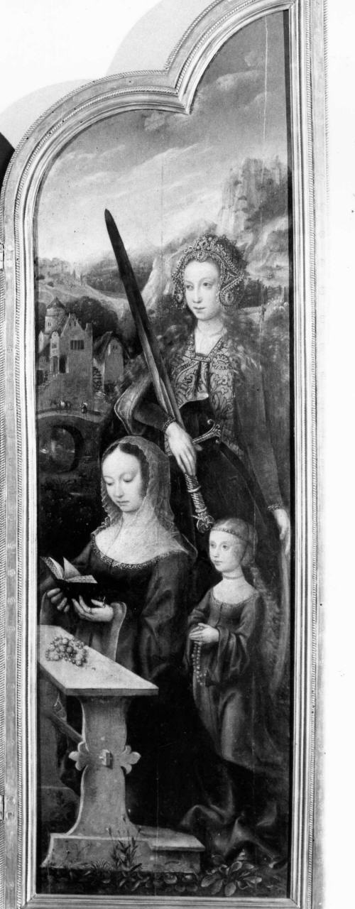 Personaggi: Santa Caterina d'Alessandria. Attributi: (Santa Caterina d'Alessandria) ruota; spada. Figure: donna; bambina. Mobilia: inginocchiatoio. Paesaggi