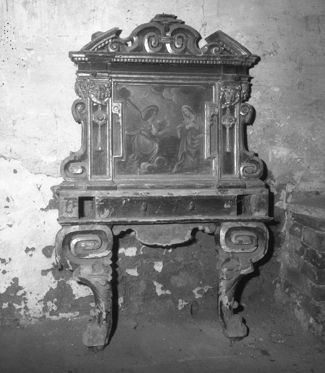 Testata di cataletto caratterizzata da una ricca decorazione intagliata e dalla pittura del pannello centrale raffigurante L'Annunciazione. Le due gambe sono in formadi voluta floreale richiudentesi a spirale e sorreggono la testata di forme architettoniche. Quest'ultima presenta infatti due lesene, entro le quali si inseriscono maschere decorative, che sorreggono un frontone ad arco semicircolare spezzato; entro di esso si innesta una decorazioen costituita da due volute affrontate richiudentesi a spirale
