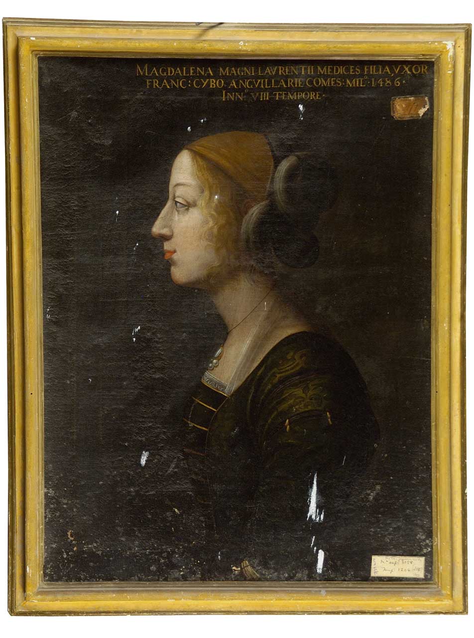 - NOTIZIE STORICO CRITICHE Il dipinto, conservato presso i depositi del Soffittone di Palazzo Pitti, raffigurante il ritratto di Maddalena de' Medici, figlia di Lorenzo il Magnifico, faceva parte delle collezioni medicee, come dimostrano gli inventari del 1637. L'opera è stata eseguita da un artista fiorentino, nel primo quarto del XVI secolo; la tela è copia dall'originale del 1486 eseguito dal Botticelli