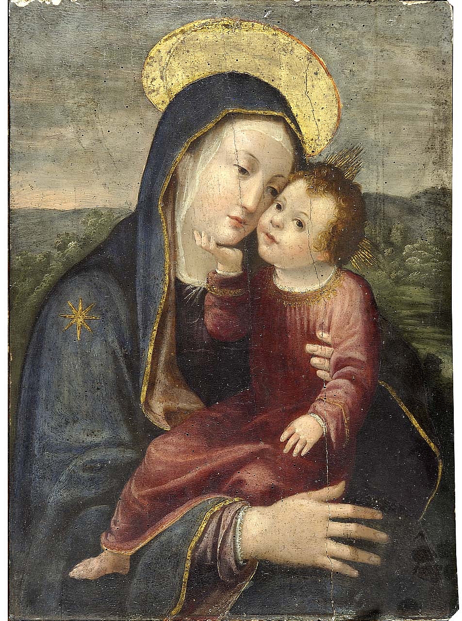 - NOTIZIE STORICO CRITICHE Dipinto di difficile ambientazione esecutiva raffigurante la Madonna con il Bambino sullo sfondo di un paesaggio selvoso. Nella tavola sono presenti riferimenti stilistici alla cultura figurativa dell'Italia settentrionale tra Piemonte e Lombardia evidente nel gruppo della Madonna con il Bambino, uniti da un atteggiamento di affetto molto naturale, nella rotondità e delicatezza dei volti, dagli incarnati morbidi, nella sensibilità pittorica, nell'uso di vestire il Bambino con una lunga tunica e nel paesaggio, caratterizzato da leggeri tocchi di luce. Del dipinto è conservata nei depositi della Galleria Palatina un'altra versione su fondo scuro e con varianti nei colori probabilmente coeva ma ascrivibile ad altra mano