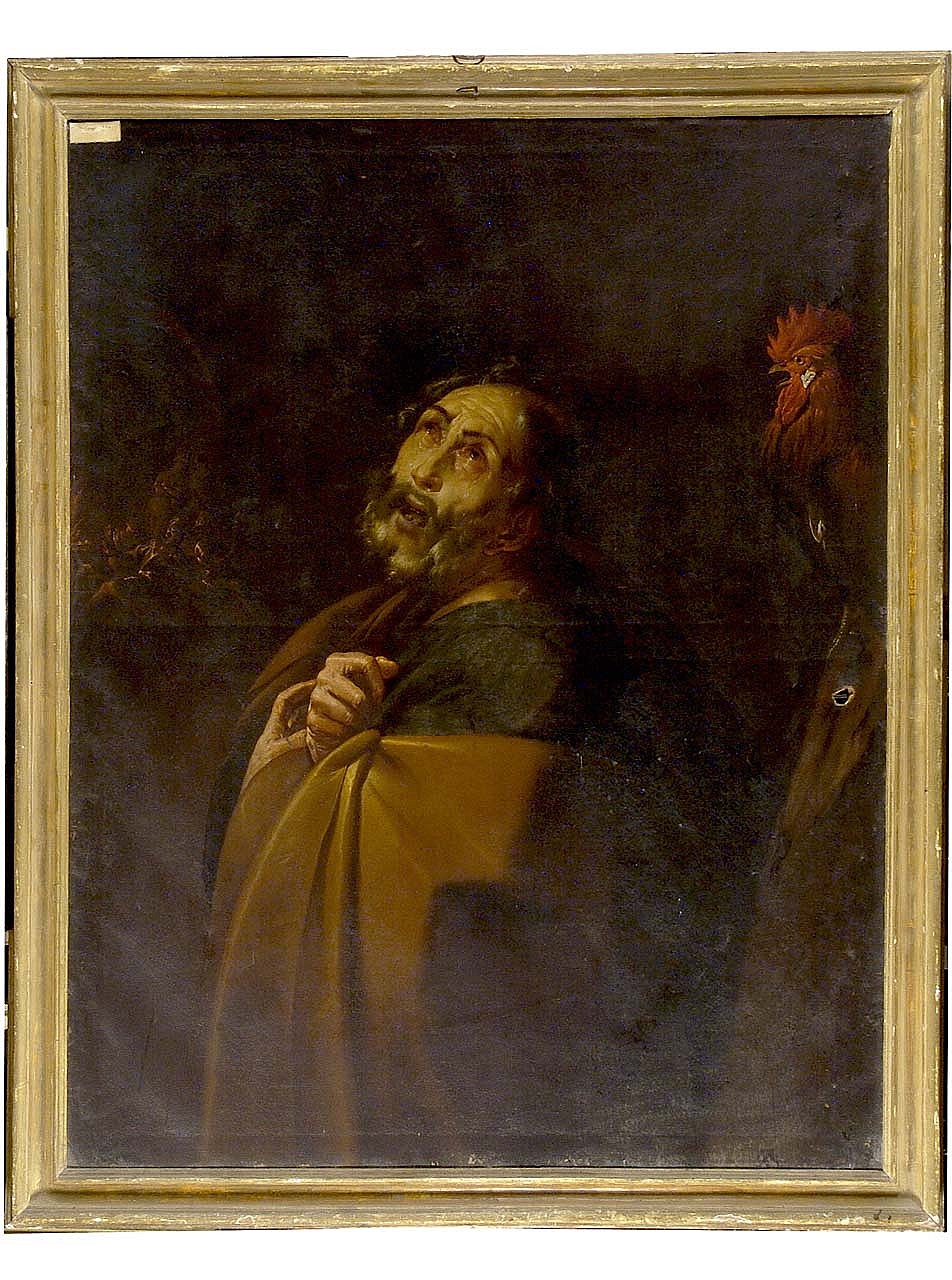 - NOTIZIE STORICO CRITICHE Il dipinto raffigura San Pietro in lacrime dopo essersi accorto di aver tradito Gesù; oltre alla figura del santo in primo piano è visibile il gallo che appunto ricorda il tradimento e un gruppo di figure sul fondo delle quali non è ben chiaro, visto il generale annerimento della superficie pittorica, che cosa rappresentino. Stilisticamente il dipinto si colloca in area lombarda e per il timbro coloristico vivace e la pennellata sfatta, per il forte coinvolgimento emotivo trasmesso dal volto sfigurato dal dolore di San Pietro e per la ripresa di motivi fiamminghi si accosta alla pittura del Cerano e si data ai primi anni del Seicento