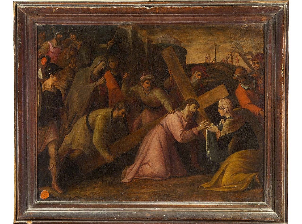 - NOTIZIE STORICO CRITICHE Il dipinto di non grandi dimensioni risulta, come indica un cartellino a tergo della tavola, proveniente dal Convento di Sant'Apollonia a Firenze. Vi è raffigurata l'andata al Calvario di Cristo nel momento in cui la Veronica si accosta a Gesù per detergergli il volto. Si tratta di un dipinto dall'intenso ma equilibrato carattere devozionale che si colloca stilisticamente in area fiorentina. E' ormai completamente superato il carattere manieristico di tipo vasariano a favore di una narrazione molto composta obbediente ai dettami della Controriforma. Stilisticamente è molto sentito l'influsso del naturalismo nordico sul modello di Giovanni Stradano