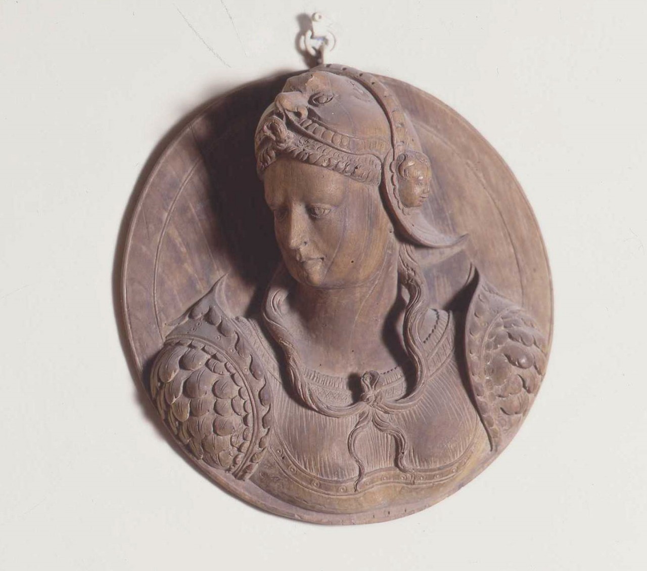 - NOTIZIE STORICO CRITICHE Per i due rilievi si ipotizza un confronto con dei bassorilievi in pietraconservati al Museo del Louvre, attribuiti alle botteghe Reali della Loira e datati 1520-1530 ca. Essi riprendono modelli decorativi quattrocenteschi toscani,diffusisi poi nel XVI sec. anche in Francia, raffiguranti imperatori romani, soldati e personaggi celebri. Spesso come nel nostro caso, sembrano affacciarsi dalla cornice con il busto e la testa. La figura femminile per il copricapo e la corazza pare identificabile con Minerva