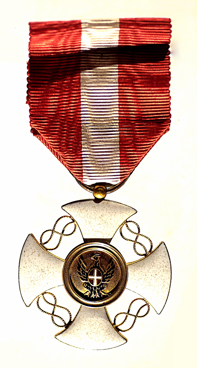 Pendente con croce patente a cerchio con nodo Savoia di raccordo tra i bracci. Su un lato al centro corona ferrea, sull'altro scudo araldico su aquila. Nastrino in gros bianco e rosso
