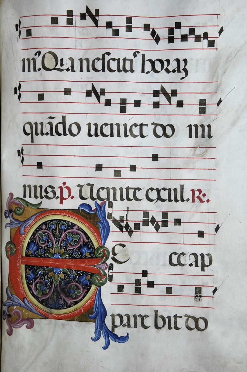Iniziale fogliata grande caudata E (Ecce apparebit dominus), rubr. Responsorius