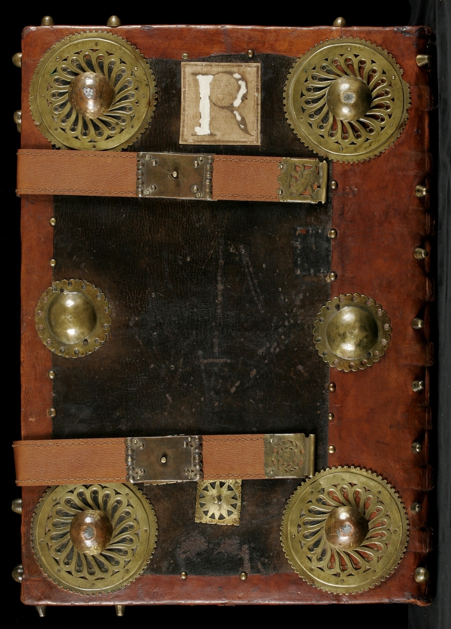 Legatura con piatti in legno ricoperti di cuoio marrone, 8 nervi sul dorso. Sul piatto anteriore sono quattro rosoni agli angoli traforati in ottone al centro dei quali è una borchia circolare, al centro di ciascuno dei due margini verticali è un'altra borchia semisferica con base a rosone; 2 bindelle di restauro tengono chiuso il codice. Il piatto posteriore conserva gli stessi 6 rosoni fermati da borchie, 3 chiodi per fermare le bindelle e un cartellino cartaceo con la lettera R a penna e inchiostro; lungo ciascuno dei due piatti dovrebbero esserci 21 chiodi ma ne risultano mancanti