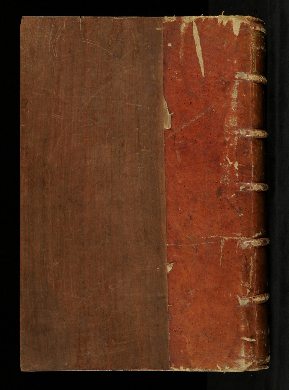 Legatura del XIX secolo con piatti in legno parzialmente ricoperti di cuoio marrone decorato sul dorso con cornici dorate ad impressione, 7 nervi sul dorso