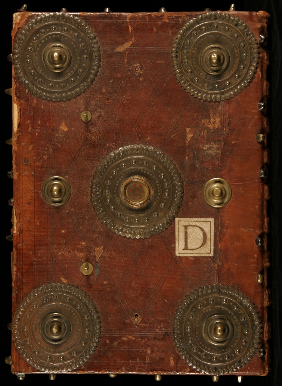Legatura originale con piatti in legno ricoperti di cuoio marrone decorato con losanghe a incisione, sul piatto anteriore: quattro rosoni metallici agli angoli con decorazioni a traforo, con motivi vegetali e zoomorfi, al centro dei quali è una borchia circolare (una mancante), un rosone più grande al centro privo della borchia centrale affiancato da due rosoni piccoli;le bindelle sono andate tutte perdute. Il piatto posteriore conserva quattro rosoni agli angoli con motivi geometrici e vegetali a sbalzo e uno centrale con stemma mediceo smaltato;i rosoni sono fermati da borchie presenti anche al centro dei margini, due chiodi