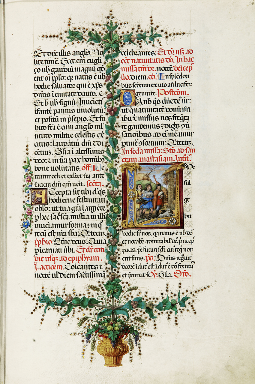 Iniziale fogliata grande con storia e caudata L(ux fulgebit), rubr. In secunda missa. Statio ad sanctam Anastasiam. Introitus. Corpo della lettera azzurro e dorato decorato con cirri e foglie; nel margine compreso tra le due colonne di scrittura si estende una coda formata da fiori e foglie, fino al margine inferiore con un grande vaso dorato pieno di frutta e dal quale escono i rami che vanno a formare la coda. Entro un paesaggio di campagna prende vita la scena dei pastori che accorrono alla capanna per vedere il Bambino; in primo piano, sul corpo della lettera sono due cagnolini mentre il gruppo di figure è formato da uno zampognaro, un pastore con un agnello e un contadino con una cesta con le uova
