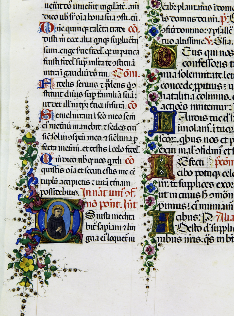 Iniziale fogliata media con figura e caudata O(s iusti), rubr. In nativitate unius confessoris non pontifices. Introitus. Corpo della lettera azzurro con decorazioni fogliacee che vanno a formare la coda. Sul fondo è rappresentato un santo francescano a mezzobusto con la tonsura e le mani giunte in preghiera