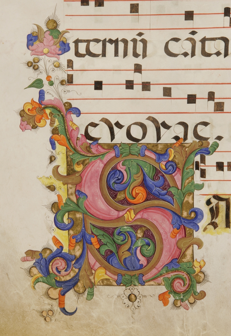 Iniziale fogliata grande caudata S (Sacerdotes tui), rubr. Aliud