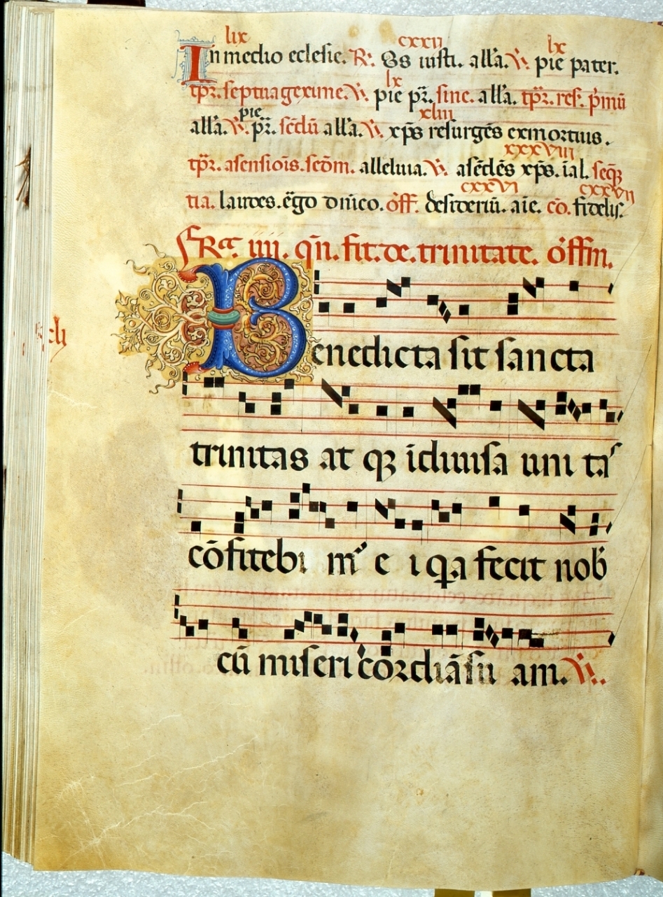Iniziale decorata piccola B (Benedicta sit sancta Trinitas), rubr. Feria IIII. De Trinitate. Officium