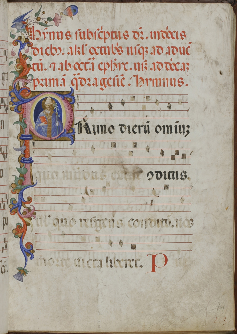 - NOTIZIE STORICO CRITICHE L'Innario 10074, contenente diverse parti di testo con le antifone dalla festa dell'Avvento a Pasqua, gli inni per le feste di santa Monica e san Nicola da Tolentino (inserite in momenti successivi alla realizzazione), già in Collezione Corsini a Firenze, proviene dal monastero di Santa Caterina a San Gaggio. Il codice è stato segnalato dal Toesca (Manoscritti miniati della Biblioteca del Principe Corsini a Firenze, 'Rassegna d'Arte', XVII, 1917, 1-2, p. 128) come facente parte della Collezione Corsini ma non ne pubblicò le miniature che attribuì a Battista di Biagio Sanguigni e ad un maestro della seconda metà del Quattrocento quelle alle cc. 195r e 200v. Toesca basò l'attribuzione al Sanguigni su un documento che al I novembre 1432 registra un "Batista miniatore" come creditore del monastero di San Gaggio per miniature di alcuni libri, tra cui "duno ynnario grande notato": le tre iniziali di questo innario rappresenterebbero, quindi, le uniche testimonianze certe dello stile del Sanguigni e il punto di partenza per ricostruire la sua attività. Le figure entro le iniziali sono tutte rappresentate frontalmente o di tre-quarti su fondo azzurro, sono campite con colori dalle tonalità morbide, mentre i lineamenti sottili sono sottolineati a inchiostro e i rilievi marcati da lumeggiature. Esse rivelano il tentativo, da parte di un miniatore di cultura ancora tardogotica, di adeguarsi alle novità rinascimentali tendando di inseguire un effetto di maestosità pittorica attraverso l'intenso fondo azzurro ma senza riuscire a imporre le figure nella spazialità. Infatti, in linea con il gusto tardogotico, il miniatore ha tentato di costruire le figure tramite la giustapposizione di campiture cromatiche contrastanti, senza riuscire a dare consistenza ai corpi