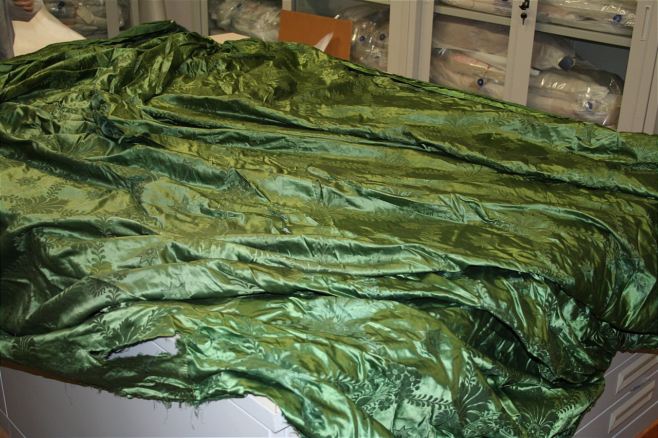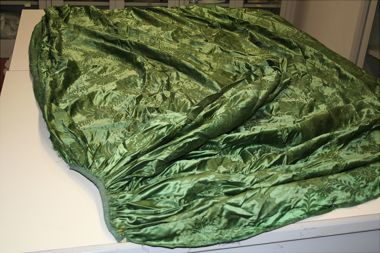 Drapperia in un unico pezzo in damasco di seta con fondo in raso, verde e opera verde