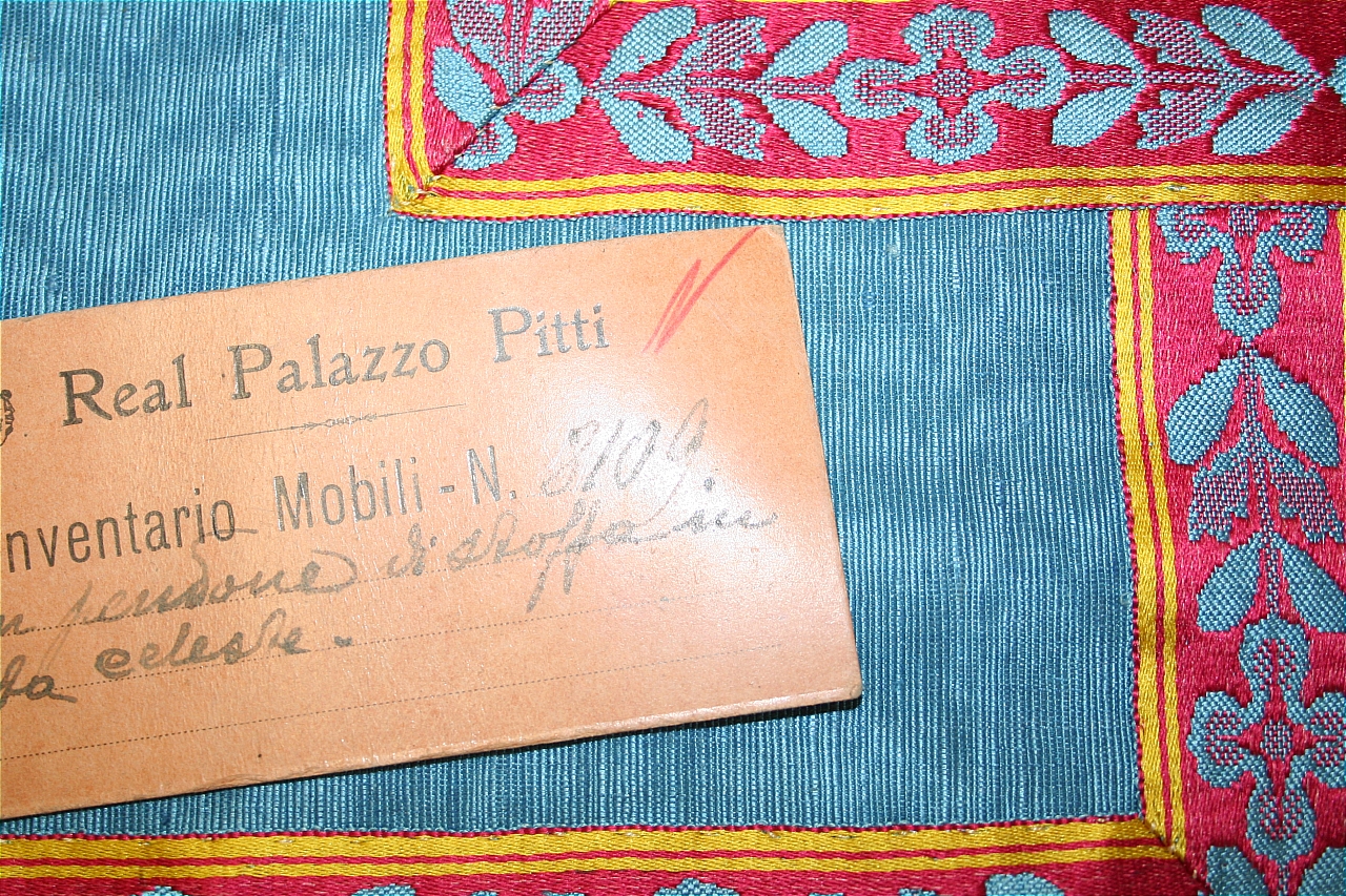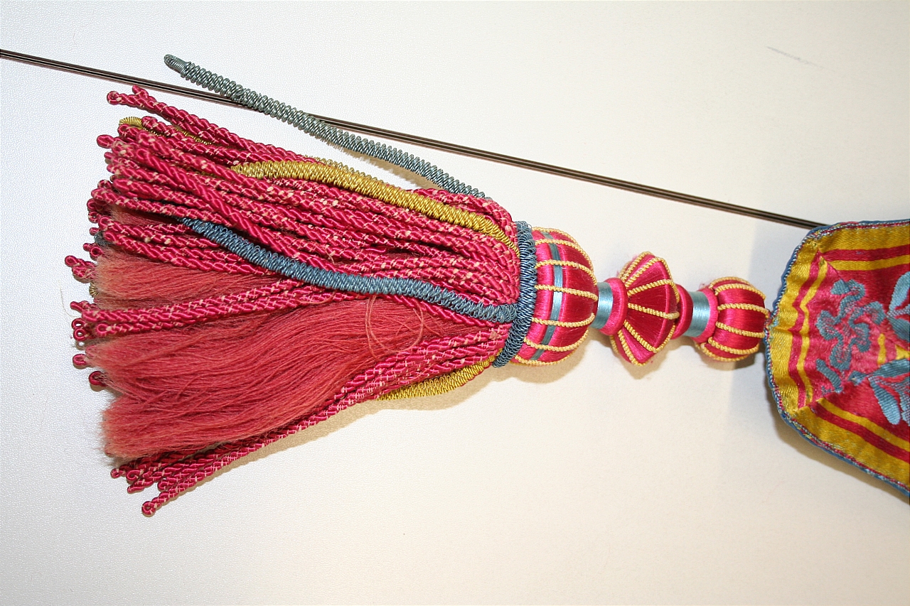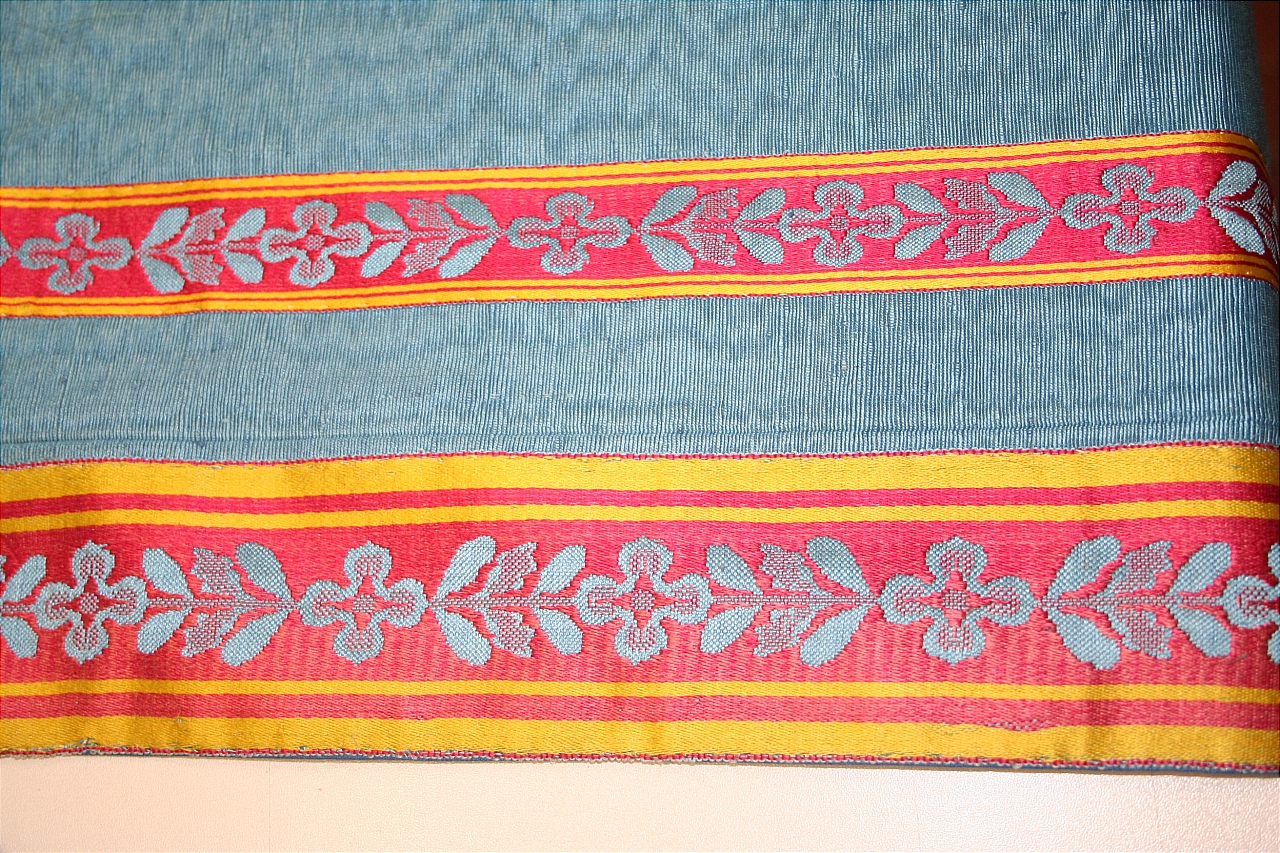 Pendone in taffetas aspetto gros marezzato, celeste, 195 x 269 cm. Bordura in lampasso di seta fondo cremisi, opera in celeste, bordo in giallo, 1,6 cm, 3 cm. Nappa in legno rivestito in seta cm 22 con grillotti in filato metallico. Fodera in cotone celeste