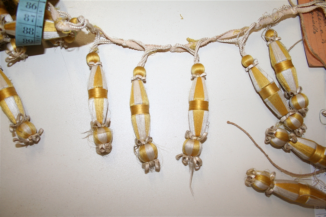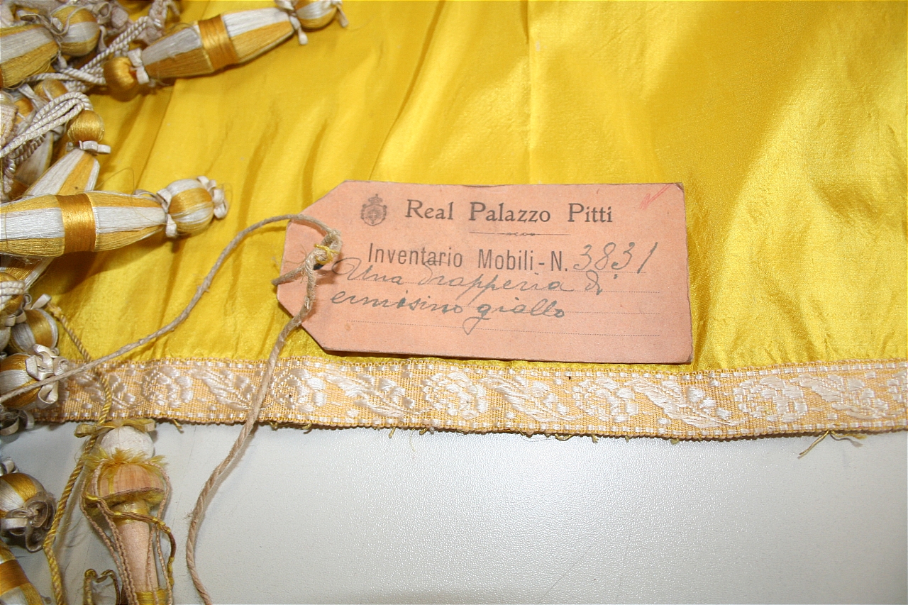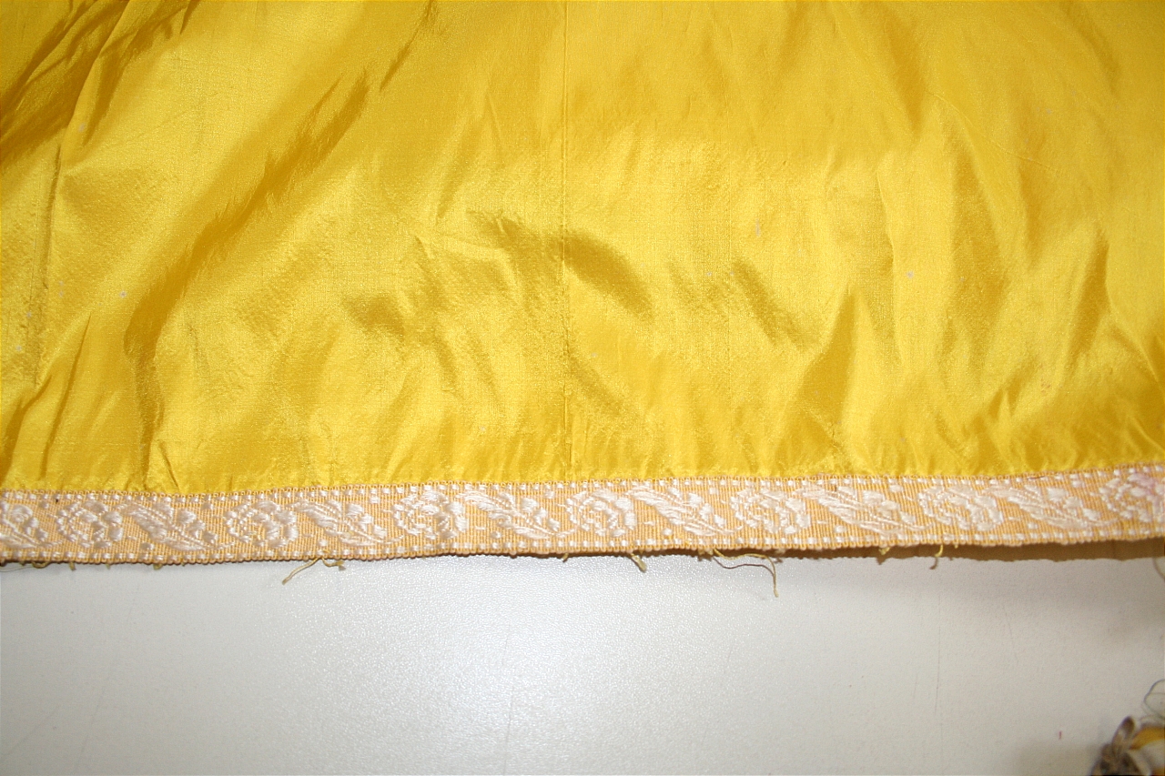 Drapperia in seta gialla. Bordura in tessuto operato di seta con opera a pelo strisciante in bianco