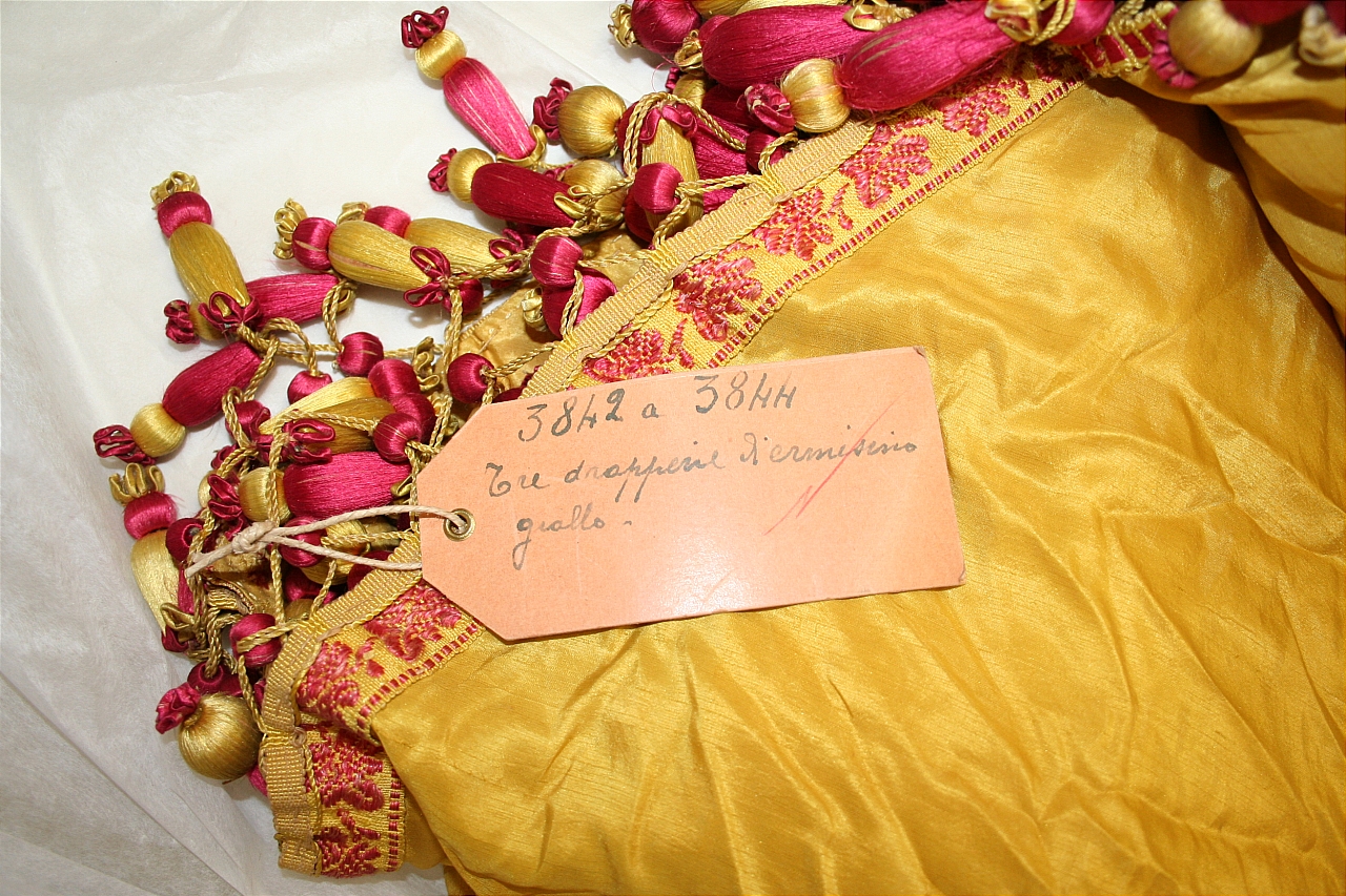 Tre drapperie in ermisino giallo. Bordura a pelo strisciante fondo giallo, opera rosso. Frangia con grillotti