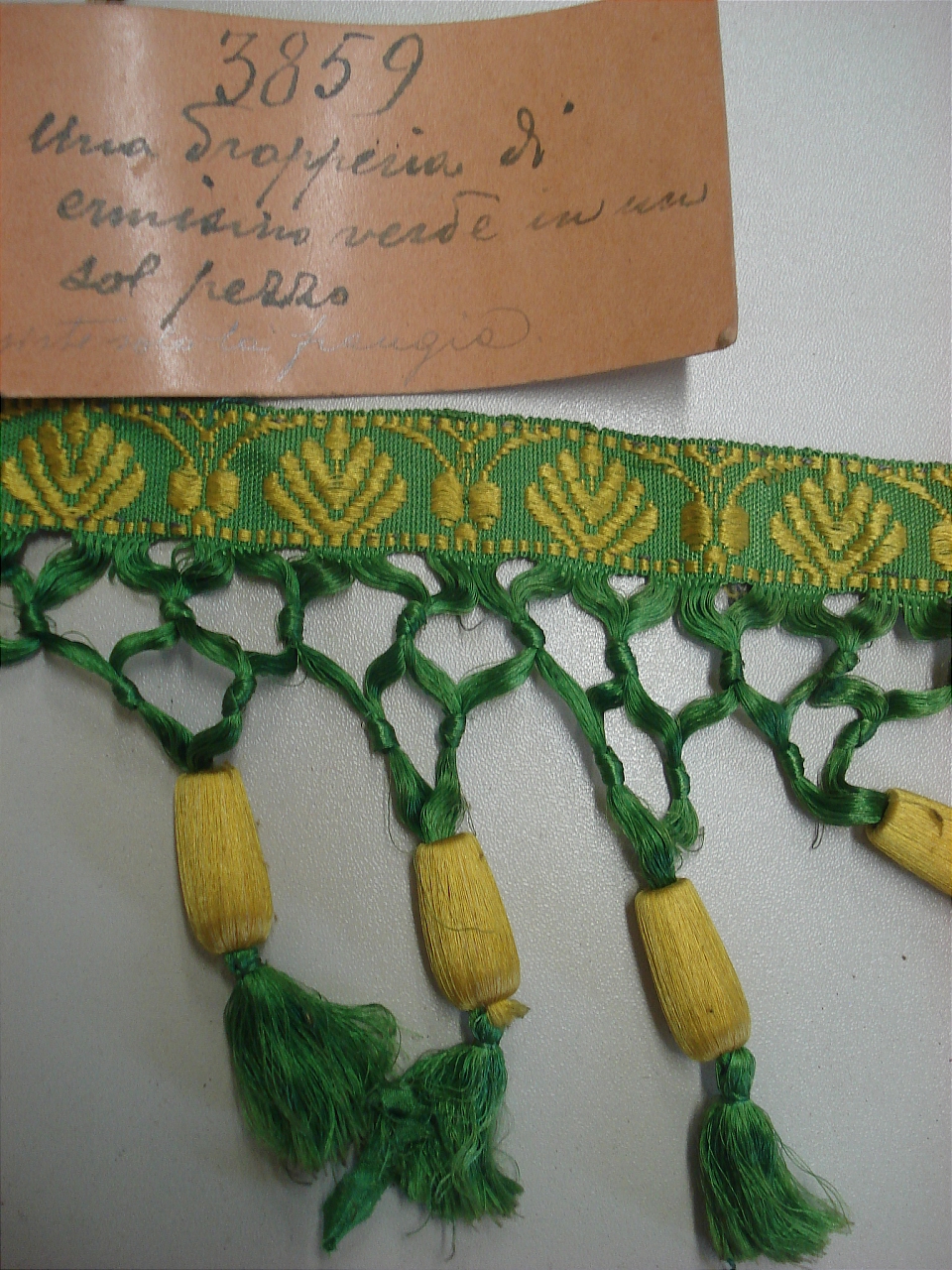 - ISCRIZIONI sul cartellino - 3859 - Una drapperia di ermisino verde in un sol pezzo esiste solo la frangia -
