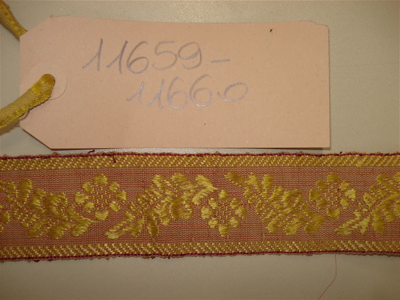 Bordura in due pezzi in tessuto operato di seta, fondo cremisi, opera a pelo strisciante giallo
