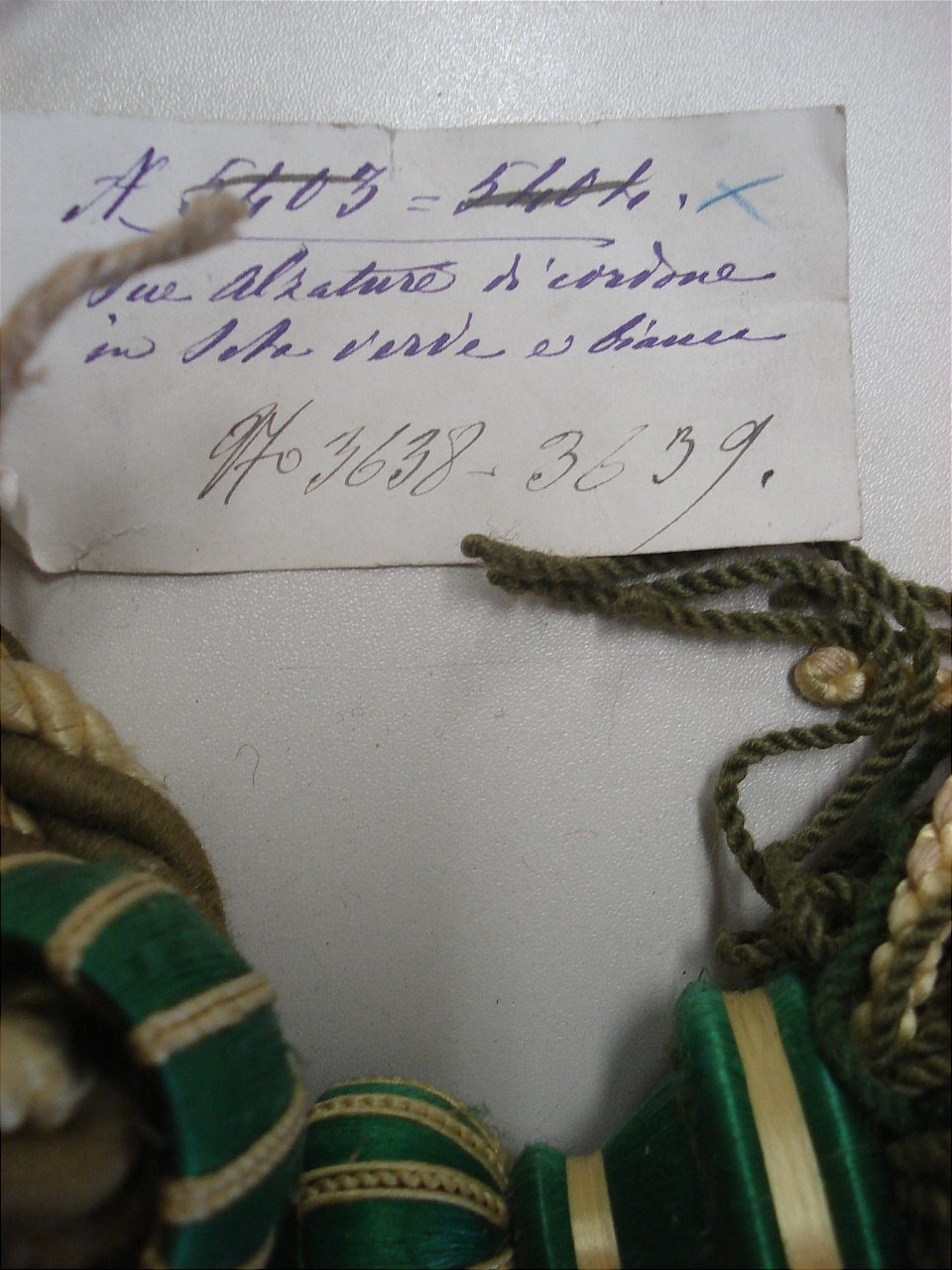 - ISCRIZIONI sul cartellino - Due alzature di cordone in seta verde e bianca N. 3638 - 3639 -