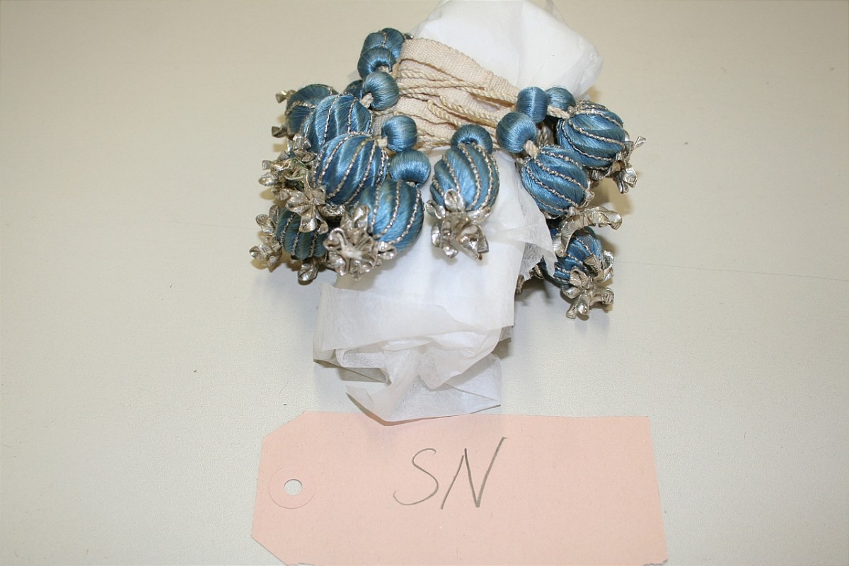 frangia con grillotti in legno rivestiti in seta celeste e filato metallico argentato