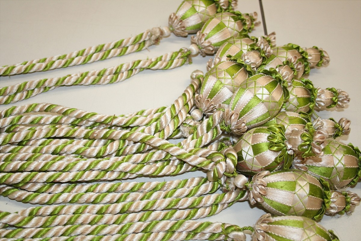 Ventidue cordoni in seta bianca e verde, terminanti con nappe ovali in legno rivestiti in seta bianca e verde.12 nappe