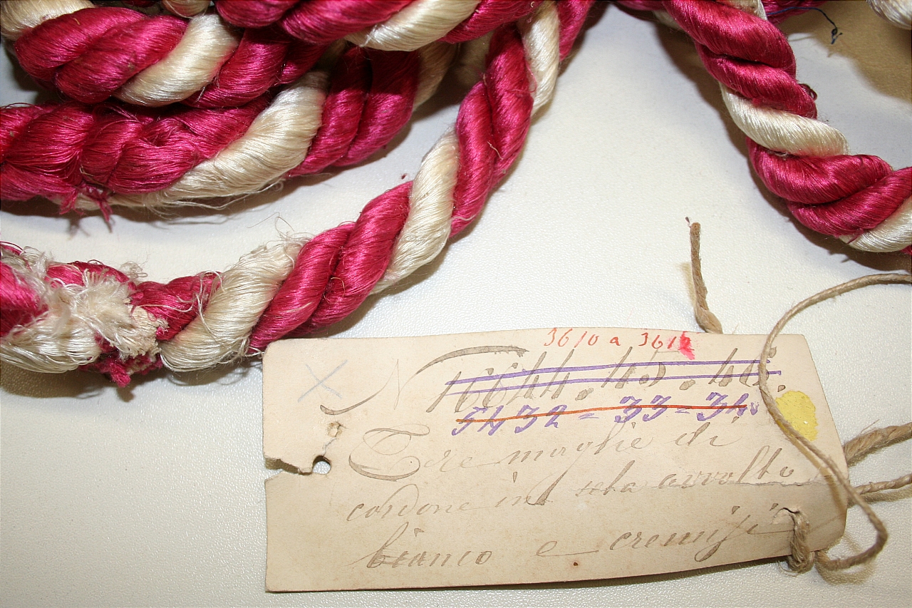 - ISCRIZIONI sul cartellino - 3610 a 3612. Tre maglie di cordone in seta avvolta bianco e cremisi -