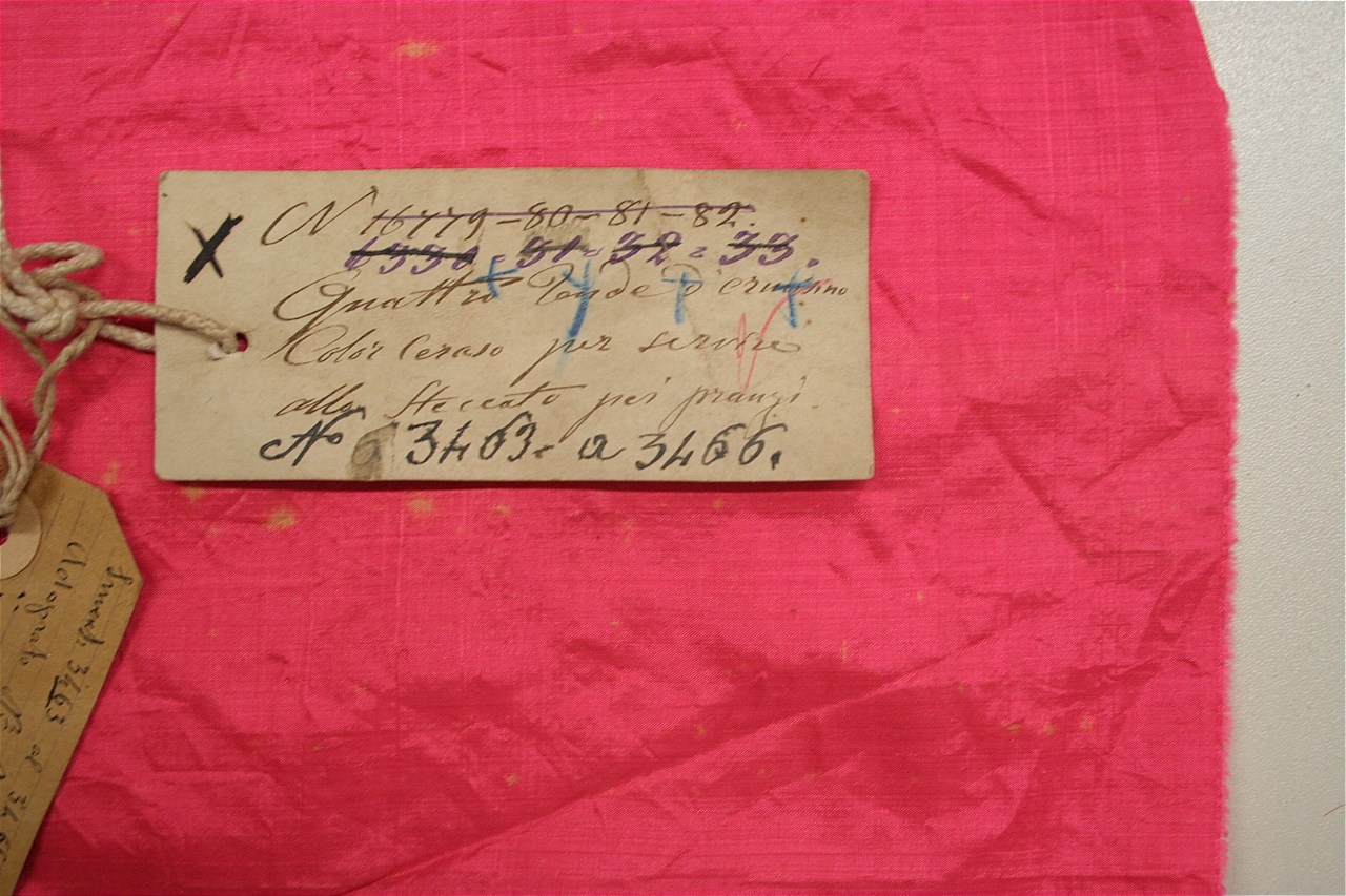 - ISCRIZIONI sul cartellino - Inv. 3463 a 3466 quattro tende di ermisino adoperato n. 4 pezzi tendone. tenda per 5 vetrine museo argenti. Dalla drapperia è stato adoperato metri 74 gallone per collocarlo ad una stanza alla Villa Petraia./ (sul retro) 3463-3466 Alcuni pezzi avanzi di tenda -