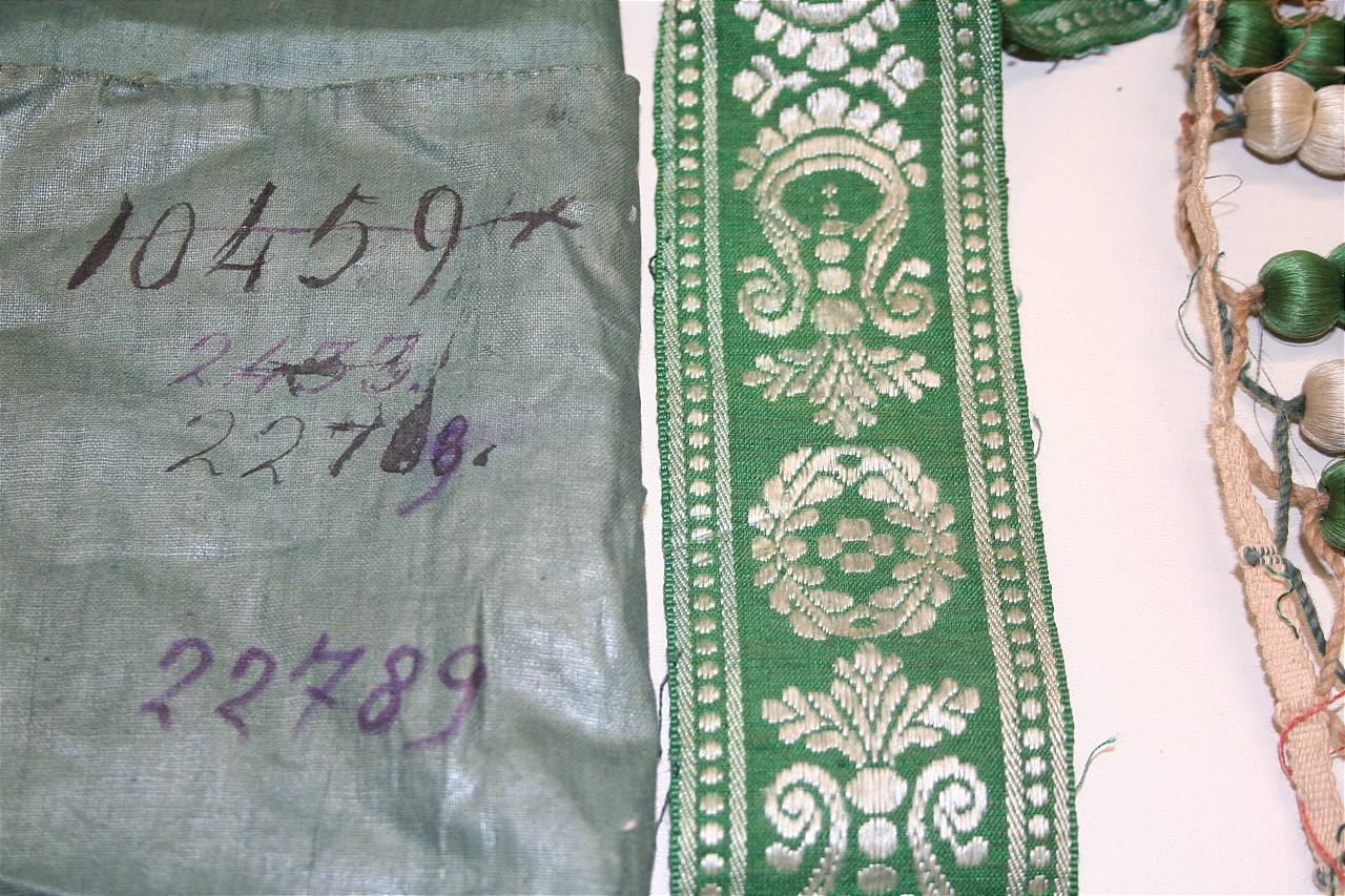 Frammenti di frangia con grillotti, bordura e fodera. Frangia con grillotti in legno rivestiti in seta bianca e verde. Bordura in tre pezzi in seta operata a pelo strisciante, fondo verde opera in bianco. Fodera in tela di lino cerata, verde